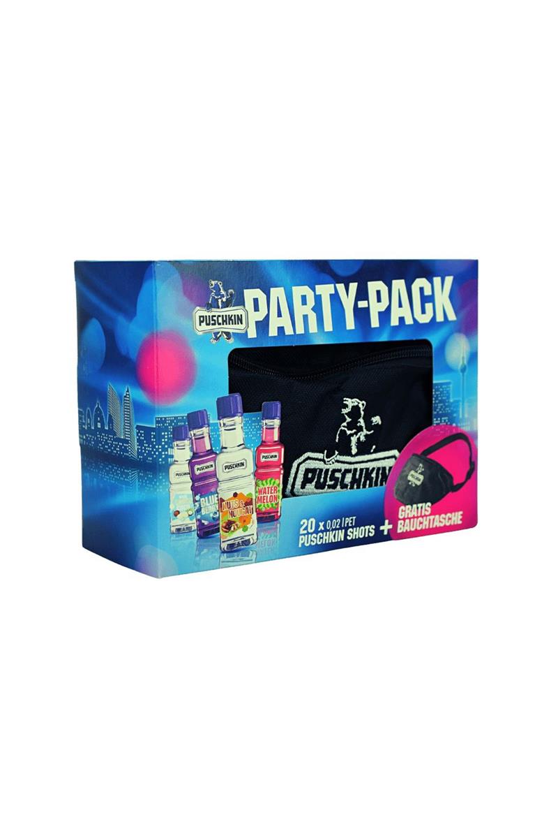 Mit dem Pushkin der Perfekte Party Starter zu dir nach Hause. Das Party Pack ist eine unterhaltsame und bequeme Möglichkeit, Puschkin Vodka mit Freunden auf einer Party oder einem gesellschaftlichen Treffen zu genießen. Die Schnapsgläser und Party-Accessoires machen das Servieren und Genießen des Wodkas in einer festlichen und unbeschwerten Atmosphäre einfach. Im Set enthalten ist eine Bauchtasche im Puschkin Design sowie Zwanzig Pushkin Fläschchen, bestehend aus 4 Sorten: