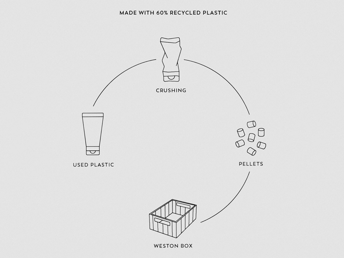 Die Weston-Boxen bestehen zu 60 % aus recyceltem Kunststoff, der größtenteils aus der Kosmetikindustrie stammt. Das bedeutet weniger Abfall von gebrauchten Materialien und weniger Produktion von neuem Kunststoff.